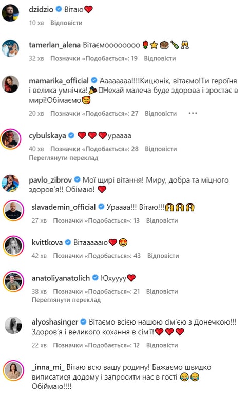 Одними з перших новоспечену зіркову багатодітну матір привітали колеги по шоу-бізнесу: співаки Михайло Хома (DZIDZIO), Павло Зібров; співачки Оля Цибульська, MamaRika, Alyosha; шоумени Анатолій Анатоліч, Слава Дьомін; блогерка Даша Квіткова та інші знаменитості.