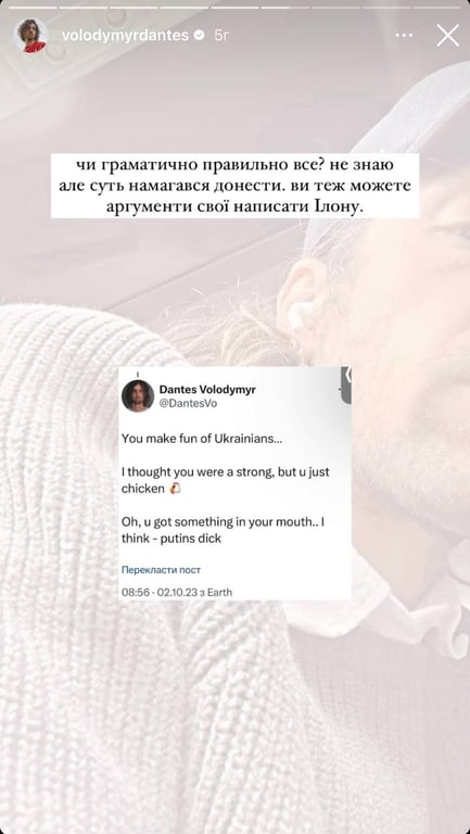 Співак Володимир Дантес розізлився через такий вчинок бізнесмена і, опублікувавши мем у себе в сторіс, зазначив, що Маск дозволяє собі насміхатися над нами всіма.