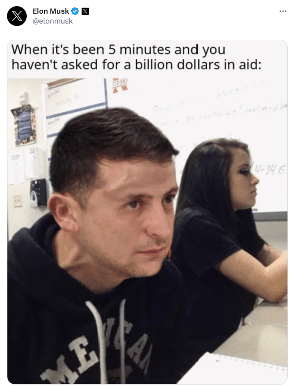 Ілон Маск поділився старим мемом про президента Володимира Зеленського, який "постійно просить про військову допомогу", і додав до нього цинічний підпис.