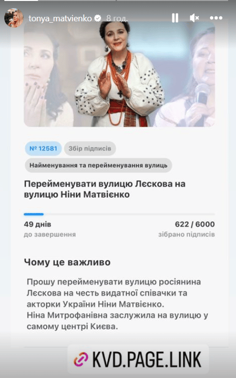 Тоня Матвієнко зробила репост петиції та залишила посилання у своїх соцмережах. Так співачка підтримала ініціативу киянина.