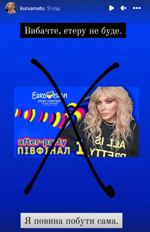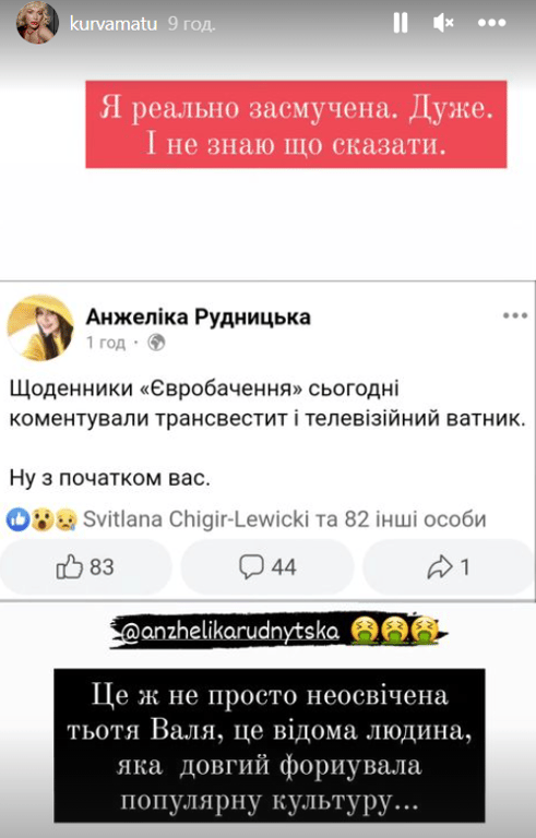 "Щоденники "Євробачення" сьогодні коментували трансвестит та телевізійник ватник. Ну з початком вас", — написала вона.