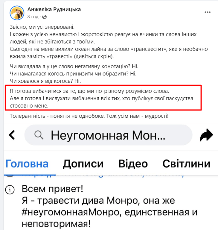 Після цунамі хейту у свій бік, Рудницька видалила публікацію. Але своєї позиції щодо Гончаренка, якого назвала "ватником", не змінила.