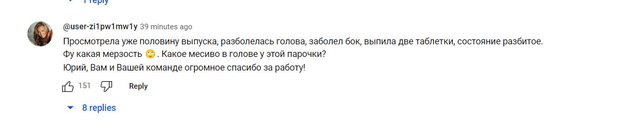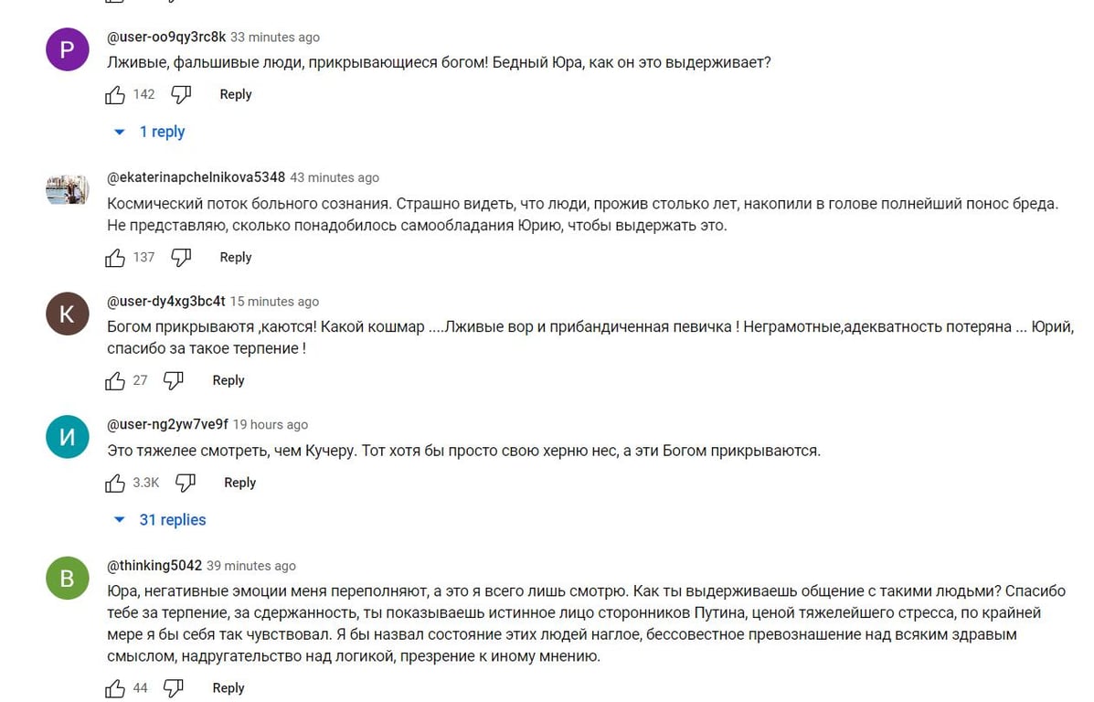 "Космічний потік хворої свідомості. Страшно бачити, що люди, проживши стільки років, нагромадили в голові цілковитий пронос марення. Не уявляю, скільки знадобилося самовладання Юрію, щоб витримати це", — коментують підписники каналу.