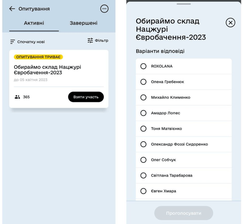 Кожен охочий може долучитися до голосування впродовж тижня, з середи, 29 березня, по 5 квітня включно. Українці віком від 14 років можуть віддати свій голос тільки за одного члена журі зі списку кандидатів. Щоб проголосувати, потрібно відкрити застосунок "Дія" у розділі "Послуги" та натиснути на "Опитування".