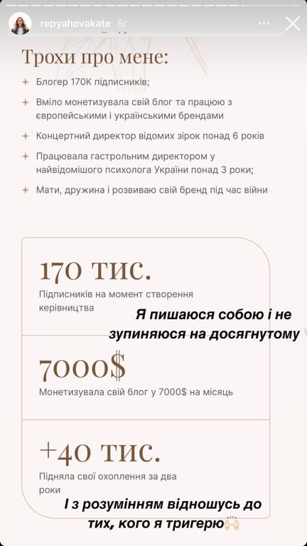 Інформацію про свою зайнятість та дохід Реп’яхова опублікувала в Instagram.