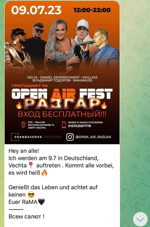 На початку липня у невеликому німецькому місті Фехта (населення 30 тисяч) запланований музичний фестиваль, участь в якому мав взяти солдат окупаційної армії Павло Радчинський та інші росіяни. Після розголосу цієї інформації в соцмережах та обурення українців і громади, його виступ скасували.