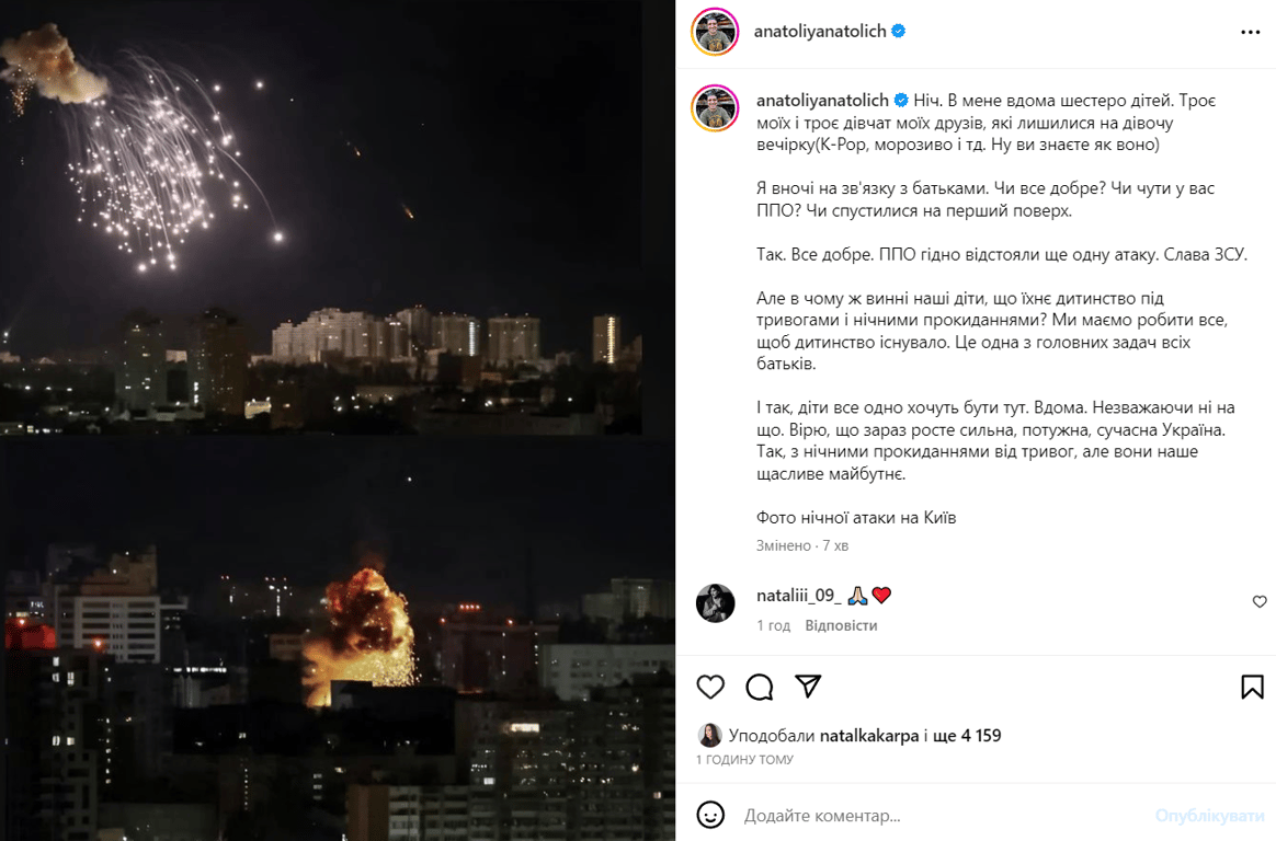 "Так. Все добре. ППО гідно відстояли ще одну атаку. Слава ЗСУ. Але в чому ж винні наші діти, що їхнє дитинство під тривогами і нічними прокиданнями? Ми маємо робити все, щоб дитинство існувало. Це одна з головних задач всіх батьків. І так, діти все одно хочуть бути тут. Вдома. Незважаючи ні на що. Вірю, що зараз росте сильна, потужна, сучасна Україна. Так, з нічними прокиданнями від тривог, але вони наше щасливе майбутнє", — прокоментував чергову атаку росіян Анатоліч.