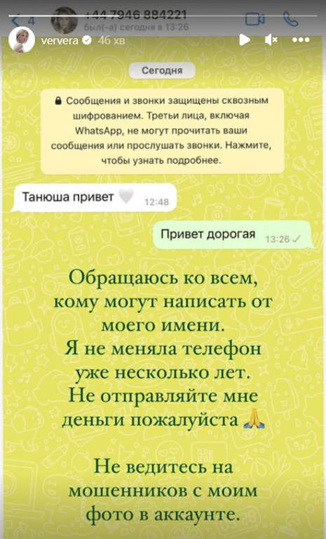Невідомі написали знайомій Віри у популярному месенджері WhatsApp з мобільного номера, який починається з +44. Це телефонний код Великої Британії. Брежнєва зауважила, що вона не змінювала номер телефону вже декілька років. Віра звернулась до всіх, кому могли написати від її імені.
