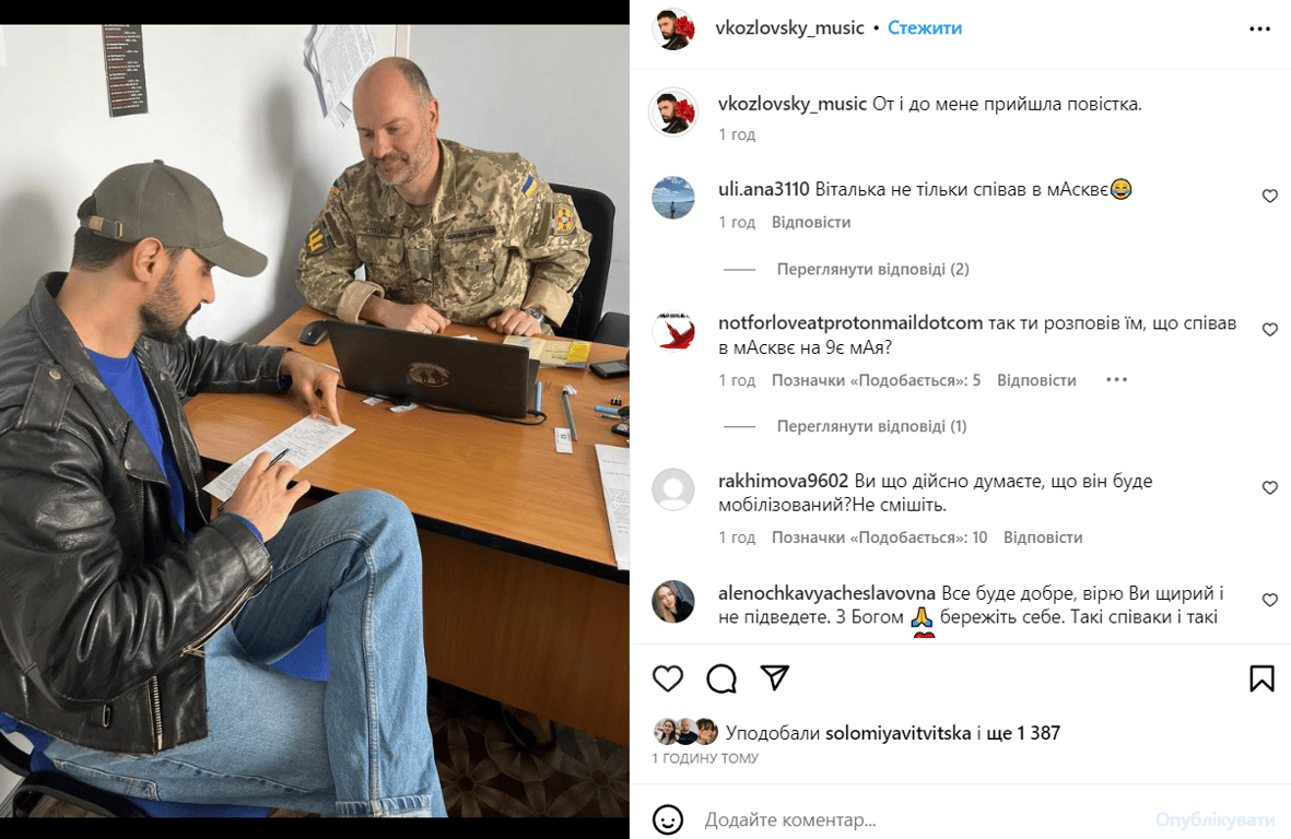 "От і до мене прийшла повістка", — лаконічно, без смайликів, підписав фото Козловський.