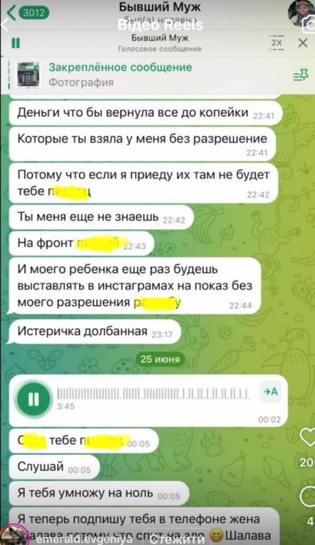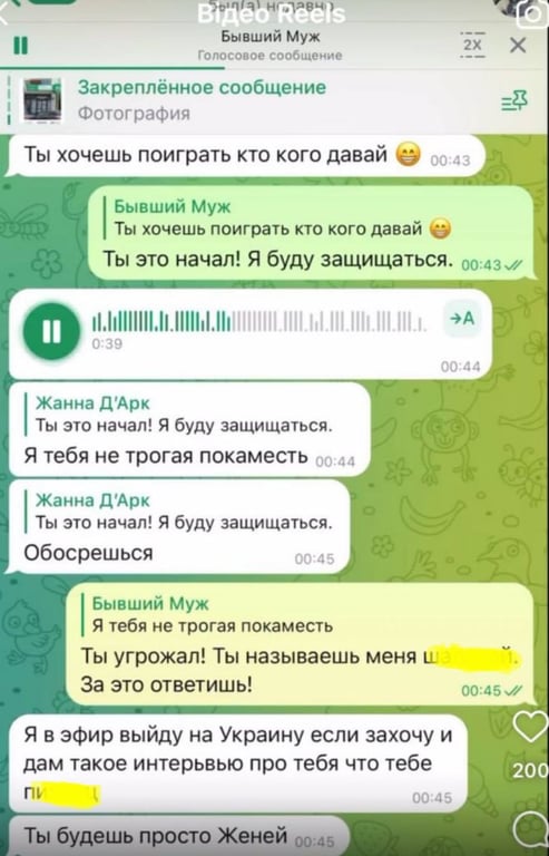Жінка оприлюднила переписки і його голосові повідомлення, у яких він обзиває Євгенію, а також погрожує їй.