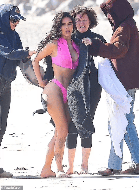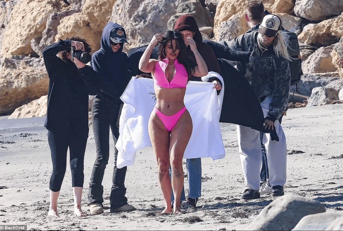 Зірка телешоу та бізнесвумен позувала перед фотокамерами у рожевому відвертому бікіні на одному з пляжів в Малібу (Каліфорнія). Між дублями команда зігрівала зірку та накривала її ковдрами. Втім, одному з папараці вдалось зробити фото.