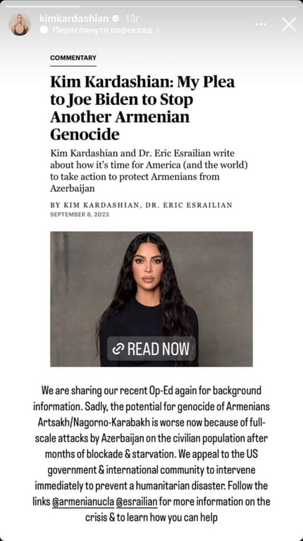 Прохання до президента звернути увагу на геноцид вірменів Кардашьян опублікувала у сторіс в Instagram, а також продублювала статтю про ситуацію між Вірменією і Азербайджаном, співавторкою якої стала.